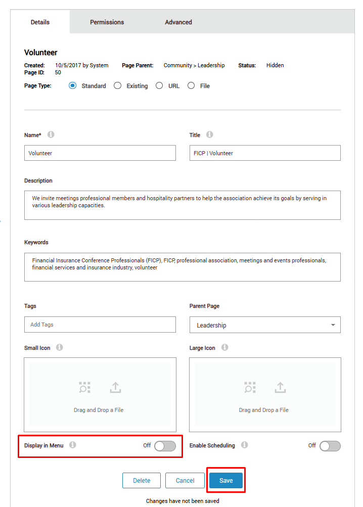 - In the page settings window on the right-hand side, there is a toggle for “Display in Menu”. Click the toggle to turn it off (it should no longer be blue. Then click Save. (See screenshot below for reference.)